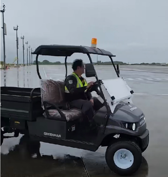 电动工作车,在机场码头的风雨中作业,能满足通过拖挂钩连接所需要的载重货物的需求,能帮助客户在工作中提高效率,展示整车动力强劲的特点。